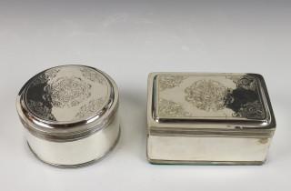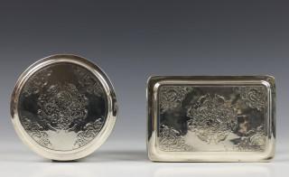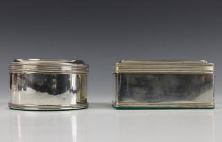 rond en langwerpig model, beide met gestileerde acanthusblad graveringen in de scharnierende deksels en geribde rand, mt. Gilles Grevink Amsterdam 1849-1861, 2e gehalte, blad met afgeronde geribde hoeken, mt. wed. Jac. H. Stellingwerf, Amsterdam, winkelier fa. Bonebakker en zoon Amsterdam 1841, 1e gehalte