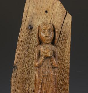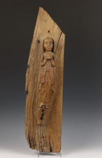 Mogelijk Vlaanderen, eikenhouten relief van biddende Maria, 17e eeuw.