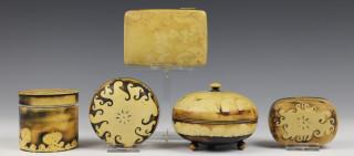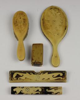 celluloid. Met onder meer borstel, spiegelhouder, poederdoos, etc.