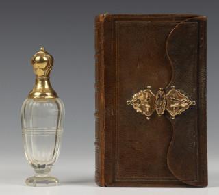 hierbij een kristallen parfum flacon met gouden montering, 19e eeuw.