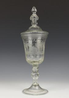 Een gegraveerde bokaal met deksel, gedateerd 1741,