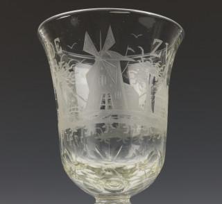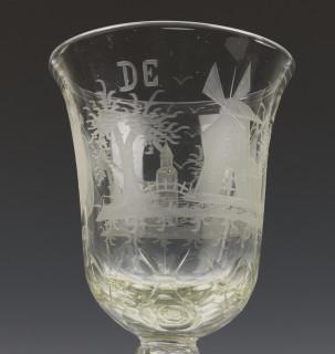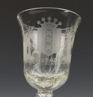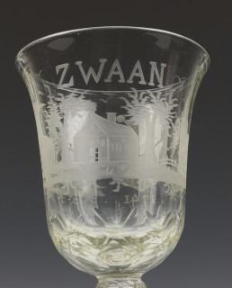 het 18e eeuwse glas voorzien van een in de 19e eeuw aangebrachte radgravure van een gekroond stadswapen van Amsterdam, een molen, een boerderij en een kerk alsmede de titel: 'De Zwaan' en datering 1741. Florale gravering op de voet en deksel.