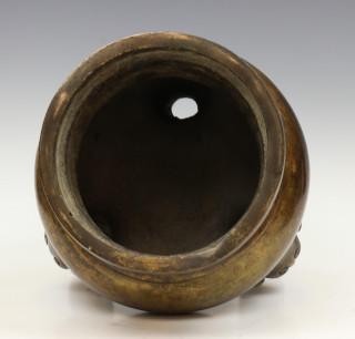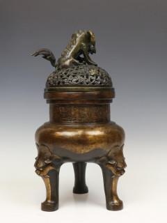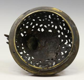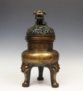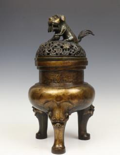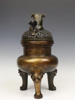 op drie poten met maskers, de bovenzijde met decoratie van gestileerde draken, de opengewerkte deksel met boeddhistische leeuw (deksel mogelijk niet bijpassend, kleine herstellingen)
