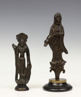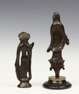 China, twee bronzen figuren van Guanyin, Tang- en Ming-dynastie,