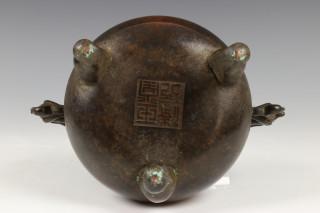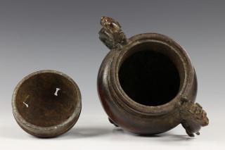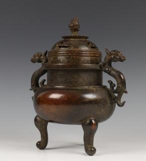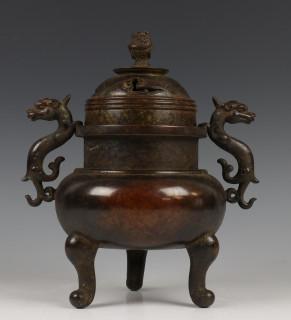 op driepoot, de zijden met drakengrepen, de opengewerkte deksel met dekselknop in de vorm van een draak
