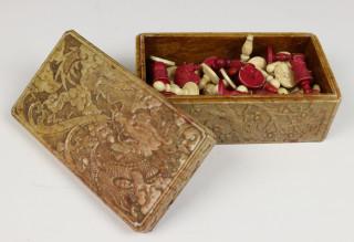 China, carved soapstone box and bone chess set, 19th-20th century, the cover carved with a dragon and the sides with prunus (some chips)