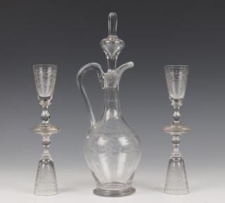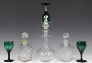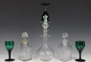 hierbij een stel kantig geslepen kleine karaffen, twee diverse karaffen en drie groene 19e eeuwse wijnglazen.