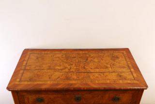 In het front drie laden met bronzen beslag. Het geheel versierd met fijnhouten inleg- en bieswerk (ontbrekend fineer en scheuren in blad en zijden)
