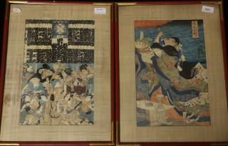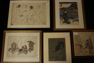 w.o. houtsnede gesigneerd Hokusai, een houtsnede met voorstelling van een kreeft en de andere met figuren. Allen ingelijst.
