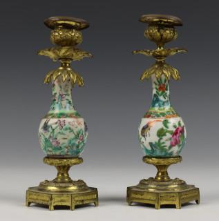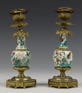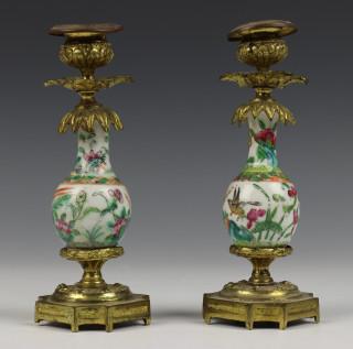 China, twee Canton famille rose vaasjes in bronzen montuur, 19e eeuw,
