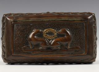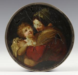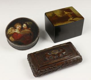 met voorstelling van figuren, hierbij een ronde Stobwasser snuifdoos met voorstelling van moeder en kind, zilveren randen. En een houten gestoken snuifdoos met decoratie van hazewindhonden en lauwerkrans, 19e eeuw.