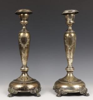 Kandelaars rond model met balustervormige stam, versierd met parelrand banden, op vier klauwpoten met acanthusblad versiering bij aanhechting, decoratieve gravure, onduidelijk mt., 3e gehalte. (deukjes)