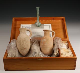 Mediterranean area, one Iron Age jar, 1200 BC, one Middle Bronze Age jar, 1850 BC and one Roman glass small vase with long neck,