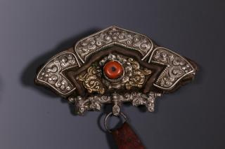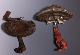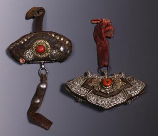 Tibet, chuckmuck, twee rijk versierde vuurtasjes. Deze tasjes, waarin traditioneel vuur aanmaakmateriaal zit, worden aan de riem gedragen samen met een tondeltasje, waarin vuursteentjes,