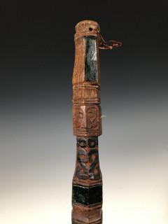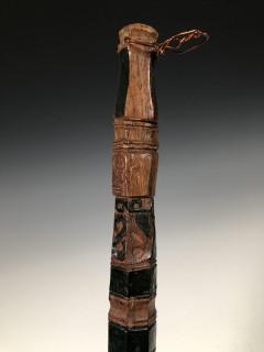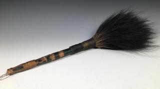 Papua, Cenderawasih Bay, ceremonial brush, the handle carved with a Korvar figure, details in black, plant fibre and casuary feathers