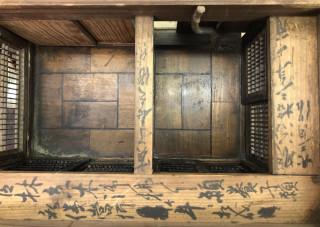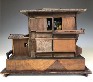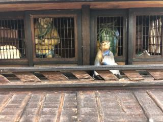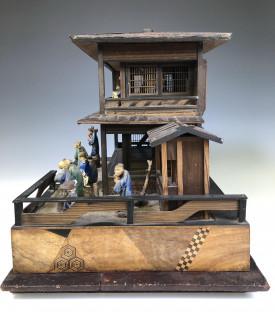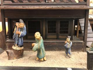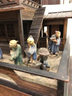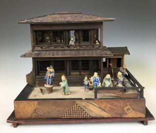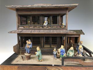 Japan, miniatuur tempel met diverse aardewerken figuurtjes op verhoogde ondergrond met Japans intarsia, Meiji Periode