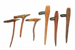 Papua and PNG, a collection of three adzes, wood, stone and plant fibre