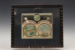 gekleurd blad met draaibare schijven voor dag, datum, etc. Uitgever: A. F. & Co. Ingelijst.