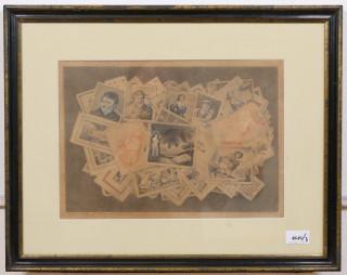 hierbij aquarel, interieur met vrouw, 19e eeuw en gravure, 18e eeuw