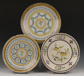 Drie polychrome aardewerken wandschotels, 18e eeuw,