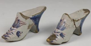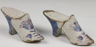 Delft, paar blauwwitte aardewerken modellen van schoentjes, 18e eeuw,