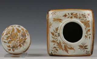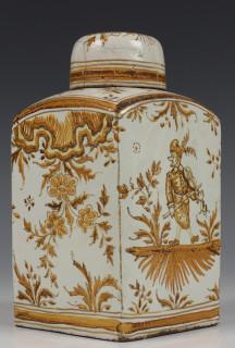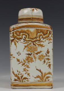 met gele decoratie van figuren en bloemen, daarbij een aardewerken theebusje met polychrome decoratie van bloemen, 19e eeuw (beschadigingen en restauraties)