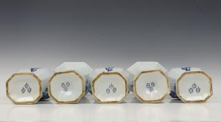 bestaande uit vijf vazen waarvan drie met deksel met papegaai vormstuk. Allen beschilderd met landelijke scenes.