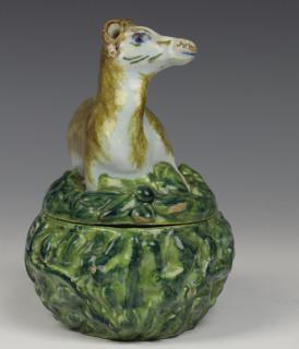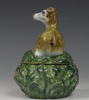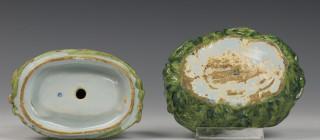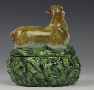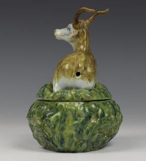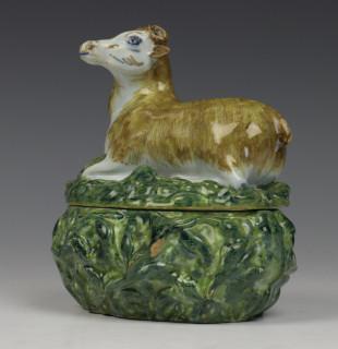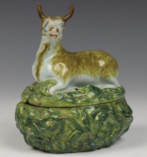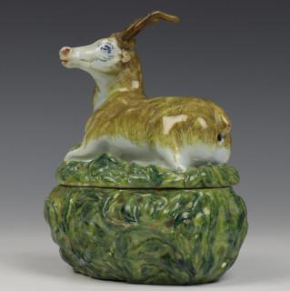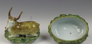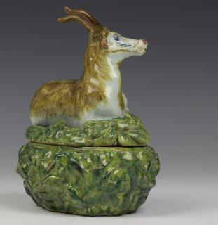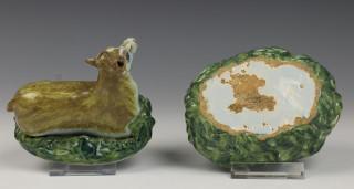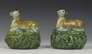 in vorm van hert liggend op groene ondergrond met bladrelief. Eén gemerkt 1 op deksel en terrine, de ander gemerkt 3 op terrine en 5 op deksel (één terrine met haarscheur en missend gewei en los oor, de ander met gerestaureerd gewei en missende oren) beschadigd)