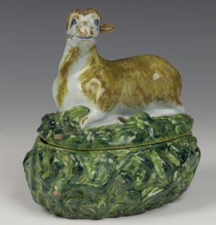 One tureen with hairline, one ear and horns missing, the other missing both ears and horns restored, overall minor loss of glaze