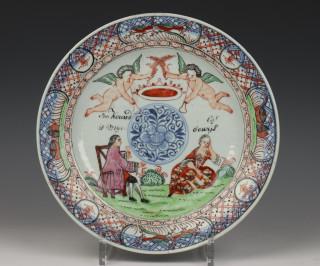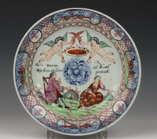 met Amsterdams Bont decor van echtpaar, putti met kroon tussen hen in en opschrift 'Het is Warm of Koel Wij zijn Sonder gevoel/SooKouwd als Eijs is mijn bewijs' (beide met randschilfertjes)