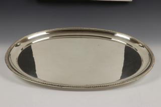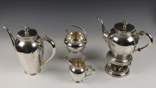 eivormig model versierd met parelrand, bestaande uit: ovaal blad, koffiepot, theekan, suikermandje, melkkannetje en rechaud, mt. D.J. Aubert & Zn. Den Haag/Voorburg vanaf 1958, 2e gehalte. (deukje in theepot)