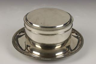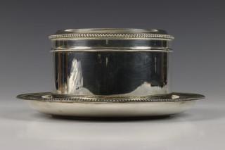 rond model versierd met parelrand, een scharnierende deksel, onderschotel met gebogen rand, mt. Fa. Aubert & Zn. Den Haag/Voorschoten vanaf 1958, 2e gehalte,