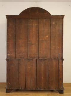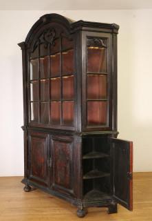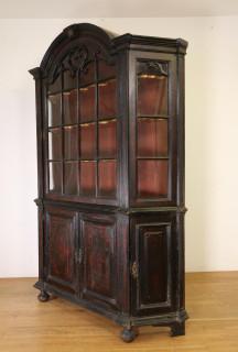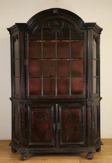 in twee verdelingen. De bovenkast met gebogen kap, waaronder deur met ruiten in vakwerk. De onderkast met vier deuren. Het geheel faux schildpad geschilderd met zwart gelakt lijstwerk