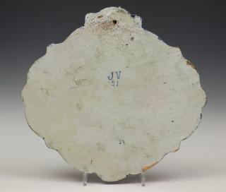 met voorstelling van figuren in landelijke omgeving. Met kwab ornamenten. Gemerkt aan de achterzijde JV 21. (herstellingen).