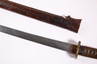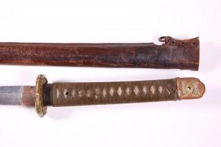 type 44. Machinaal gesmede kling en gegoten tsuba. Houten schede met één draagring en overtrokken met bruin leer.