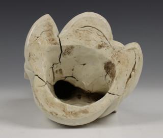 met sereen gezicht, gezeten met opgetrokken been, de rechterarm rustend op een steun met drakenkop en vogelklauw. Op houten sokkel (haarpin deels afgebroken, enkele flinters langs onderrand en mantel, bakfouten)
