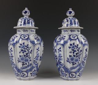 Twee blauw-wit porseleinen geribde dekselvazen