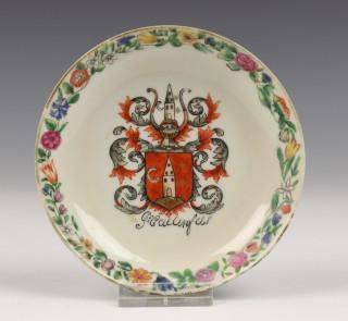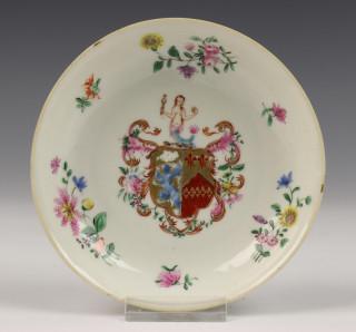 China, two polychrome porcelain armorial saucers and a Meissen-style bowl, 18th/19th century