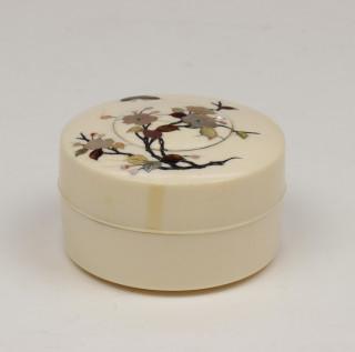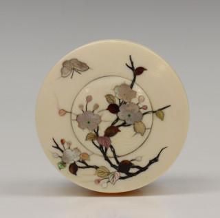 Japan, ivory shibayama box and cover, inlaid with a butterfly near a prunus branch, Meiji period