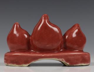 China, porcelain peach bloom brush rest, modelled as three peach with bat and lingzhi fungus, covered in a soft red glaze, 20th century