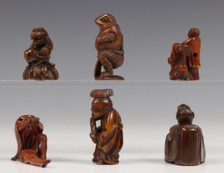 Japan, six boxwood netsuke, 19th-20th century, comprising a waking Daruma, a toad, various figures en a karashishi
