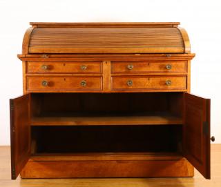 achter de jalouzie 'roltop' een interieur en uittrekbaar schrijfblad. In het front vier laden en twee deuren