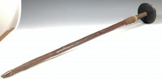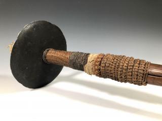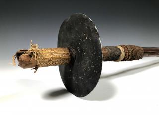 with a ground and polished green stone disc shaped head. The wooden hilt decorated with rows of plant fiber plaiting.