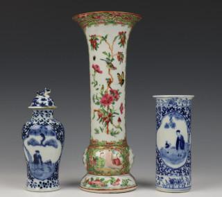 met famille rose decor van vlinders en interieur in medaillons. Hierbij blauw wit porseleinen vaas, dekslevaas en schoteltje, 19e eeuw (deksel met schilfer)