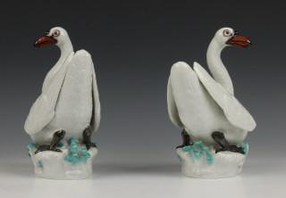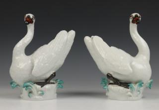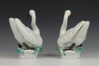 Knobbelzwaan, op deels turkoois grondje. Genummerd 77150 en 77149 (één met miniem flintertje aan voet)