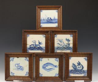 Zes blauw aardewerk tegels, 18e eeuw,