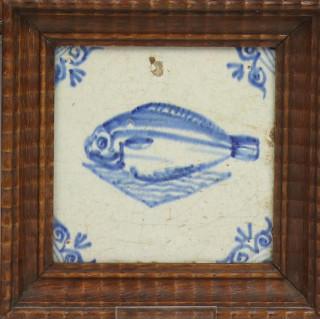 met o.a. voorstelling van platvis en vis in golven en spinnekop als hoekmotief (twee defect, een schifler). Elk in houten lijst