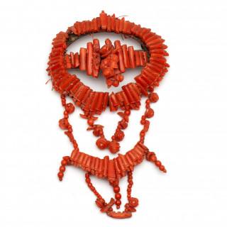 bestaande uit een ovale vorm, waaronder guirlandes. Van staafjes en bloemen van bloedkoraal