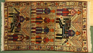 Baluch; pictorial nomadic carpet with Persian Khosrow Shirin scene, ca. 1920