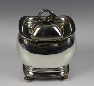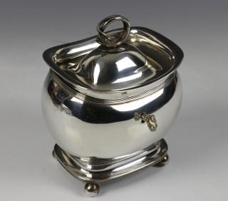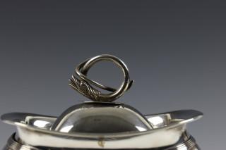 schuitvormig gebold model met filetbandranden versierd op vier bolpootjes, scharnierende deksel met knop in vorm van opgekrulde slang, mt. Hermanus van Delden Zwolle 1814/1858, 1e gehalte, met sleuteltje, herstellingen,